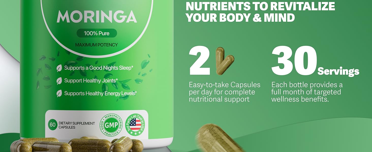 Each serving (two capsules) contains 800mg of Pure Nutrient-Rich Moringa Powder - A Natural Green Antioxidant Superfood. Our Moringa is passionately grown, ethically sourced, and produced with your health in mind.
